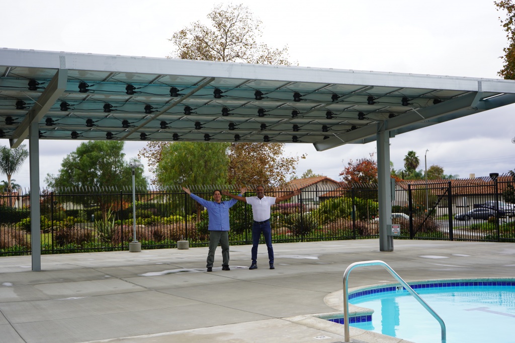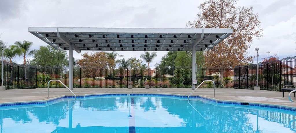Yes, we did just say you can install a solar system to run your pool pumps. Pool pumps are powered by electricity and are able to reliably run on solar power just like other electrical equipment. You can install solar to power your pool pumps even if you don’t have a pump room or community room with a large roof. Solar and pools are a 2 for 1 common area upgrade. Solar modules can be installed on a patio cover type structure and a covered seating or picnic area near the pool is created in the common area under the solar modules while the solar modules power your pool pumps. What a great capital improvement project for the HOA residents.